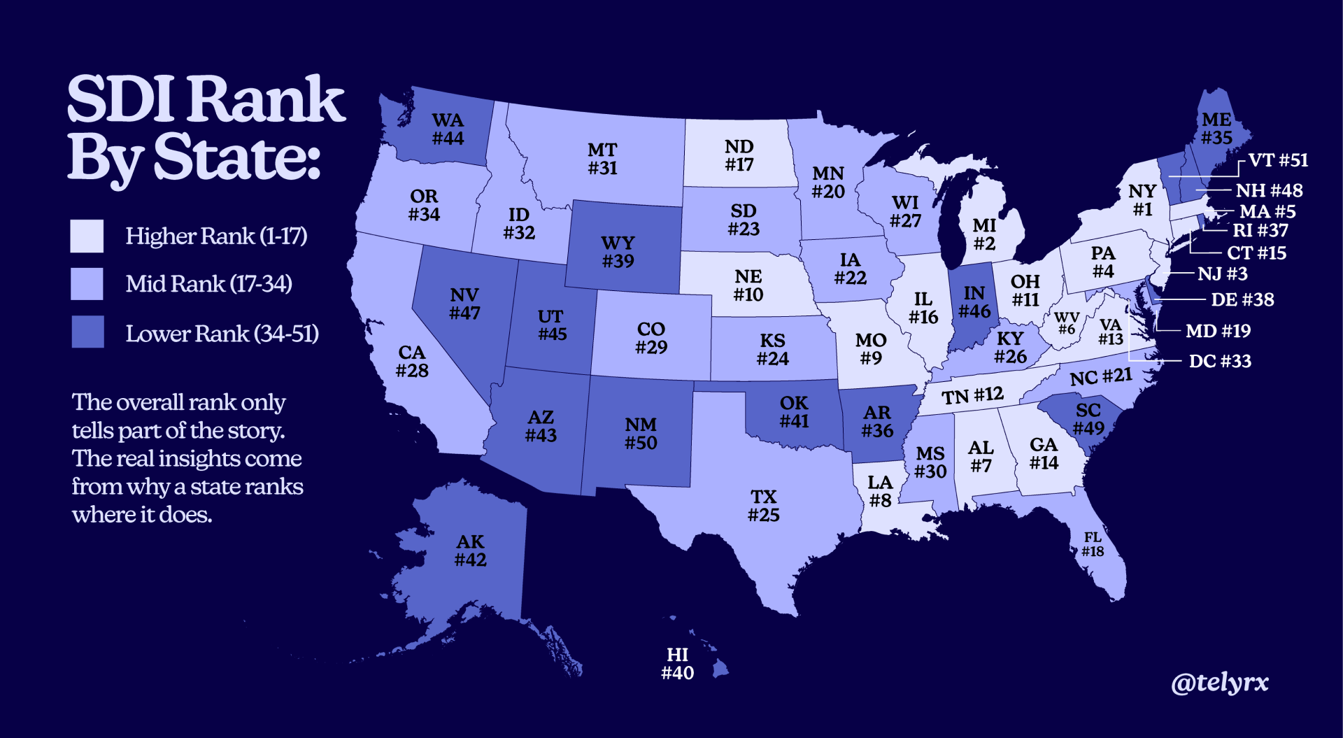 Vermont (Rank 51) and Wyoming (Rank 39) have some of the highest Geography Friction scores (95.0 and 75.2, respectively) due to their high rural populations. The obvious solution to this distance problem is telehealth.