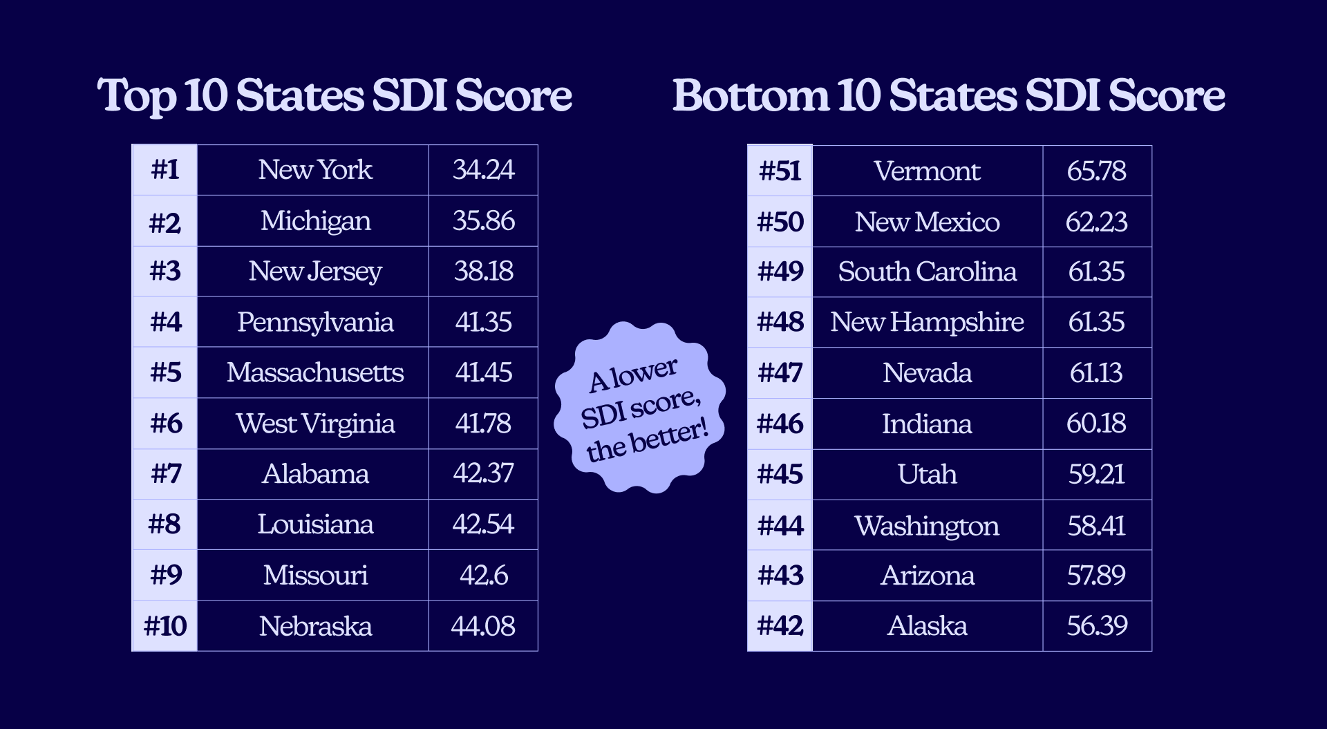 We folded dozens of variables from our data into five key pillars. For the final SDI score, lower is better, meaning faster, cheaper, and easier care. Here’s what we measured: