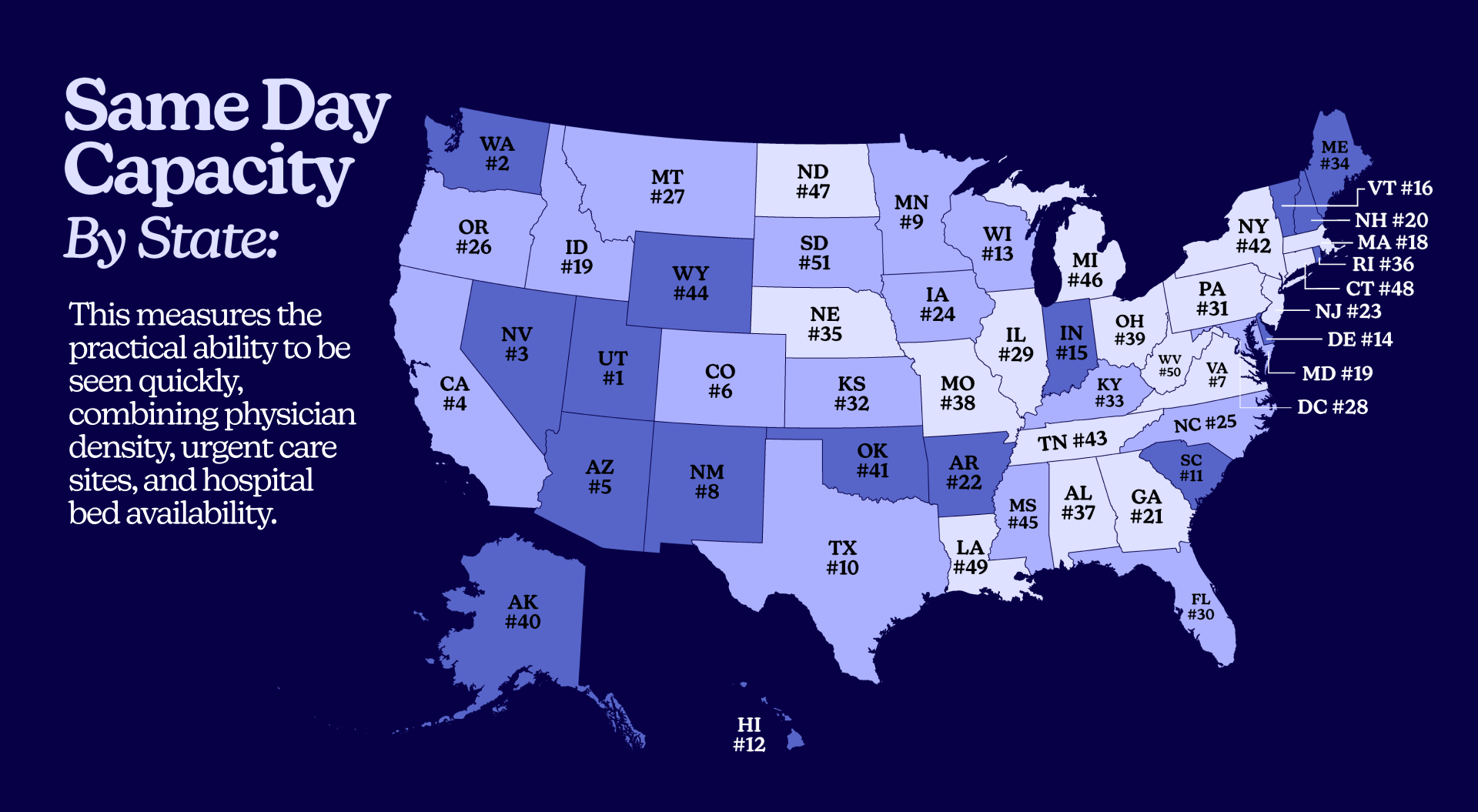 At first glance, Utah’s low rank is a mystery. It has the single best “Same Day Capacity” score (89.78) in the entire nation, driven by a strong urgent care and hospital infrastructure. So why is it ranked 45th? Because it also has the single worst “Physicians Per 10,000” (10.84).